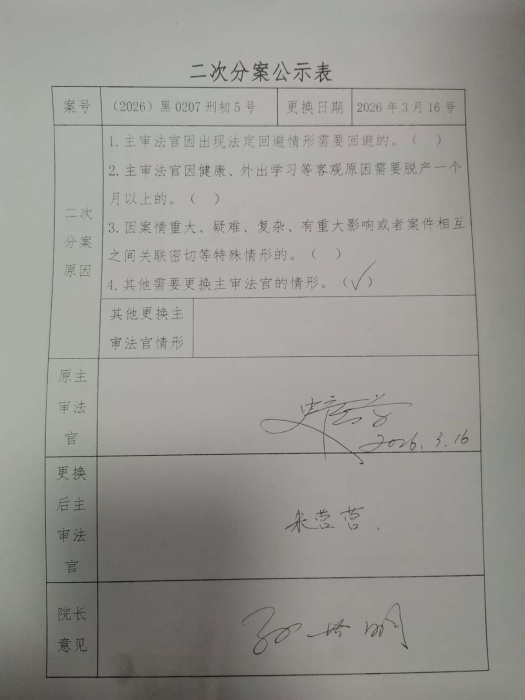 (2026)黑0207刑初5号二次分案公示